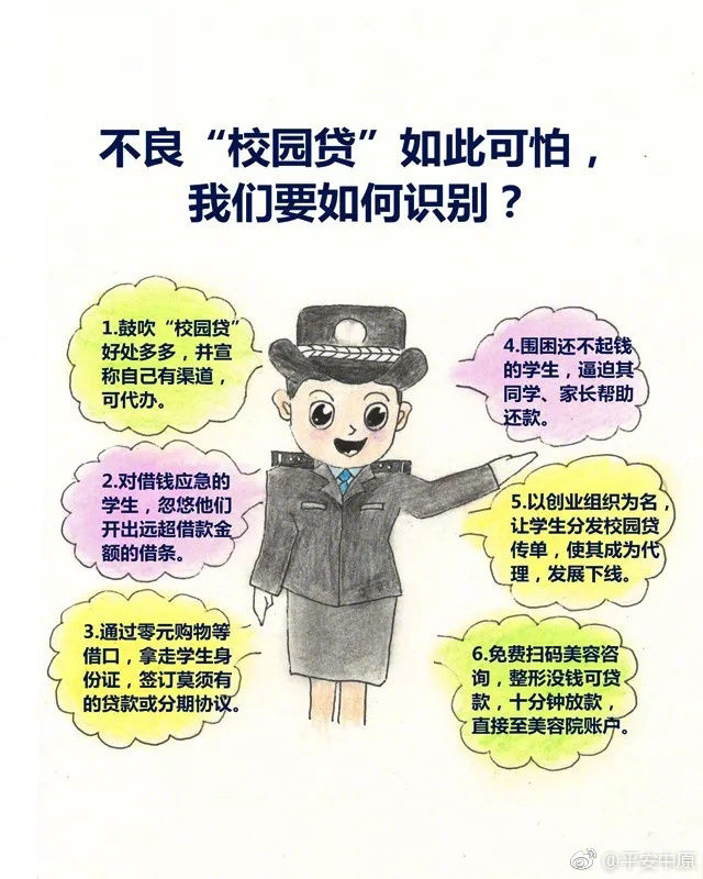 “校园贷”,简简单单三个字,背后却是一个巨大的无底洞,一旦你碰上它,迎接你的可能就是万丈深渊,有多少人听说过“校园贷”呢?那校园贷到底是什么呢?警花吴洋最新手绘漫画——《校园贷风险防范》九张图告诉你:远离校园贷,避开校园“害”!