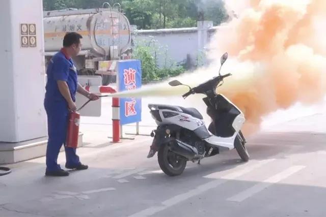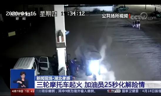 4月16日, 湖北孝感一加油站内, 一辆三轮摩托车突然起火, 工作人员杨桃生 用25秒时间灭火, 化解险情。