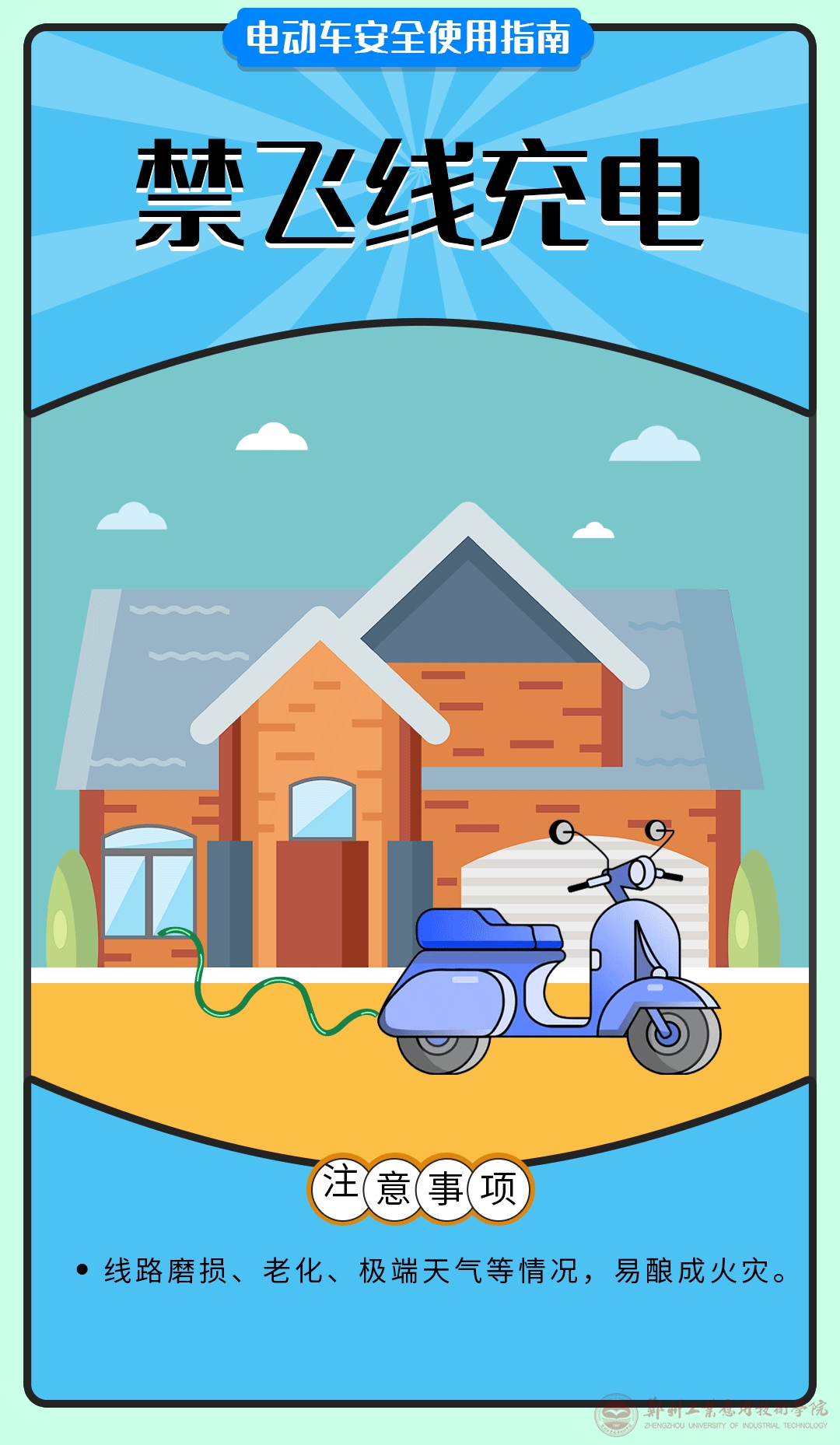四、严禁在非正规场所充电。飞线充电因线路磨损、极端天气、缺少断电保护等原因,极易酿成火灾事故。室内充电安全风险更大,更易危害人身财产安全。