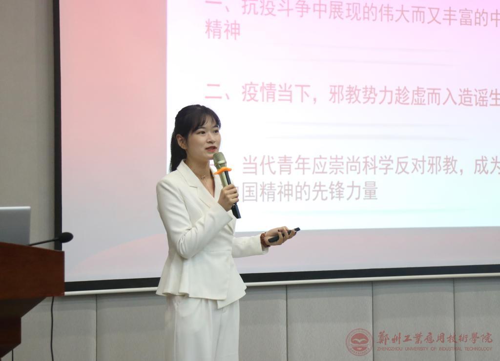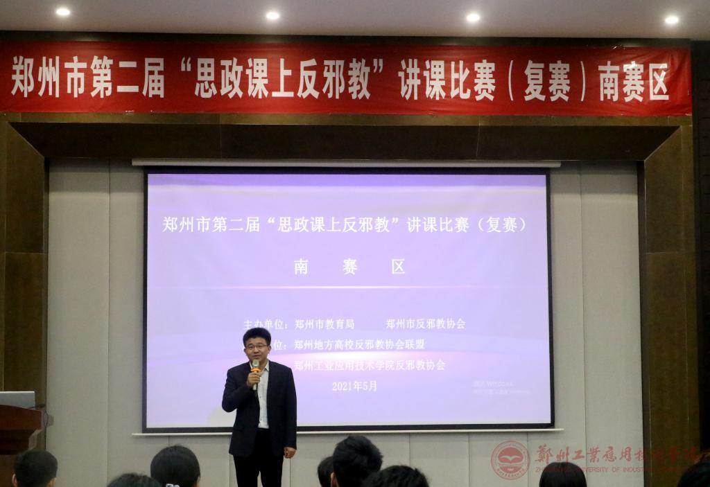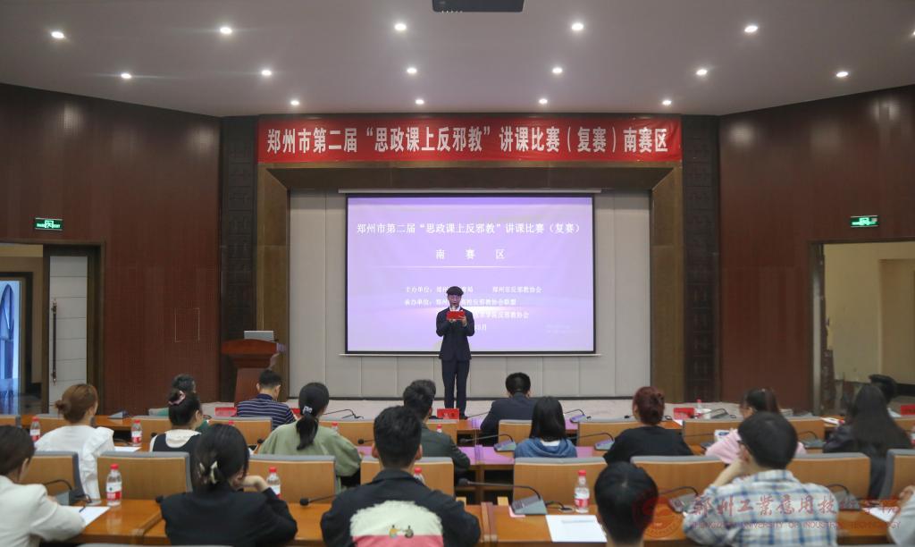 2021年5月15日,由郑州市教育局、郑州市反邪教协会主办的“郑州市第二届‘思政课上反邪教’讲课比赛(复赛)”南赛区在2138cn太阳集团建工楼天健厅成功举办。此次比赛,共有15位从事思想政教育的教师参赛,来自全市各高校的22位优秀学生代表担任评委。郑州市反邪教协会王人素副理事长、学校常务副校长闫兵教授、郑州地方高校反邪教协会联盟房国新秘书长及联盟秘书处全体成员莅临比赛现场,学校200余名学生代表观看了比赛。