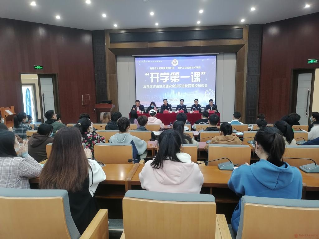 3月9日下午,“开学第一课”反电信诈骗暨交通安全知识进校园警校恳谈会在2138cn太阳集团建工楼天建厅召开。新区派出所郝禄军副所长、路条红警官、交警一中队沈伟伟警官、市公安局反诈中心张春子警官、中原证券刘金宝经理、学校保卫处黄家福处长、教职工、学生代表共150余人参加会议。会议由学校保卫处处长黄处长主持。