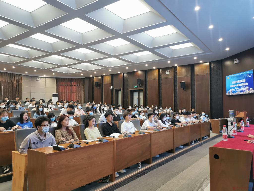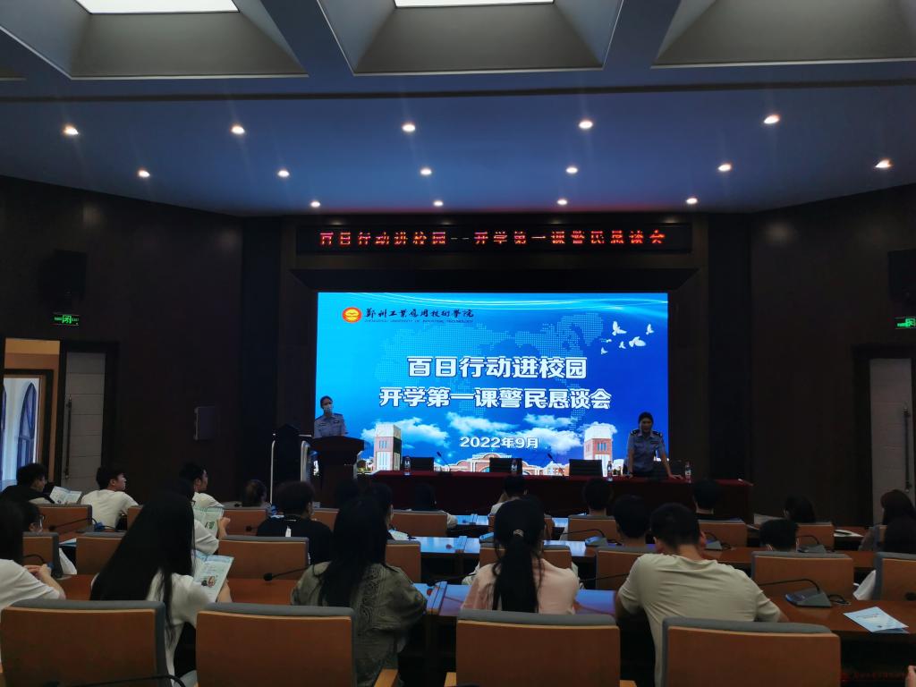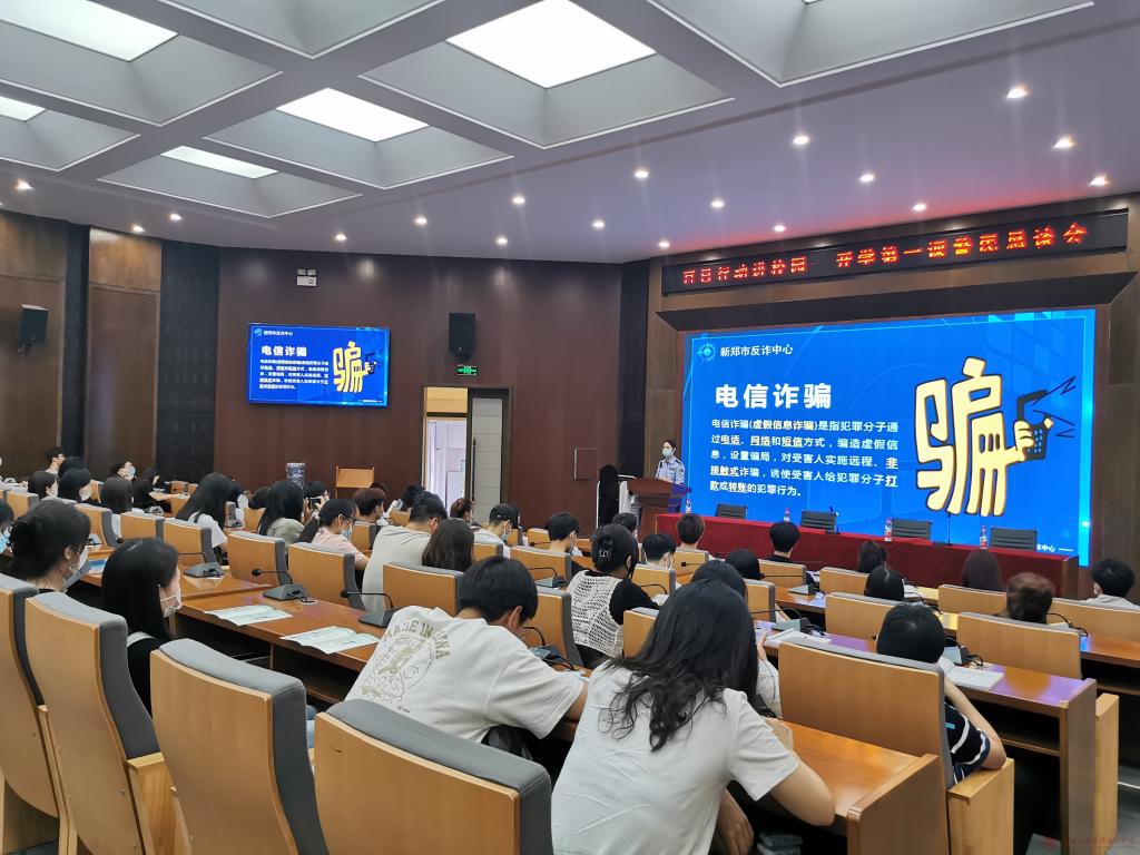 9月29日下午,百日行动进校园——开学第一课警民恳谈会在2138cn太阳集团建工楼天建厅召开。新区派出所路条红警官、市公安局反诈中心张春子警官、学校总务处贾亚如老师、教职工、学生代表共150余人参加会议。会议由新区派出所路条红警官主持。