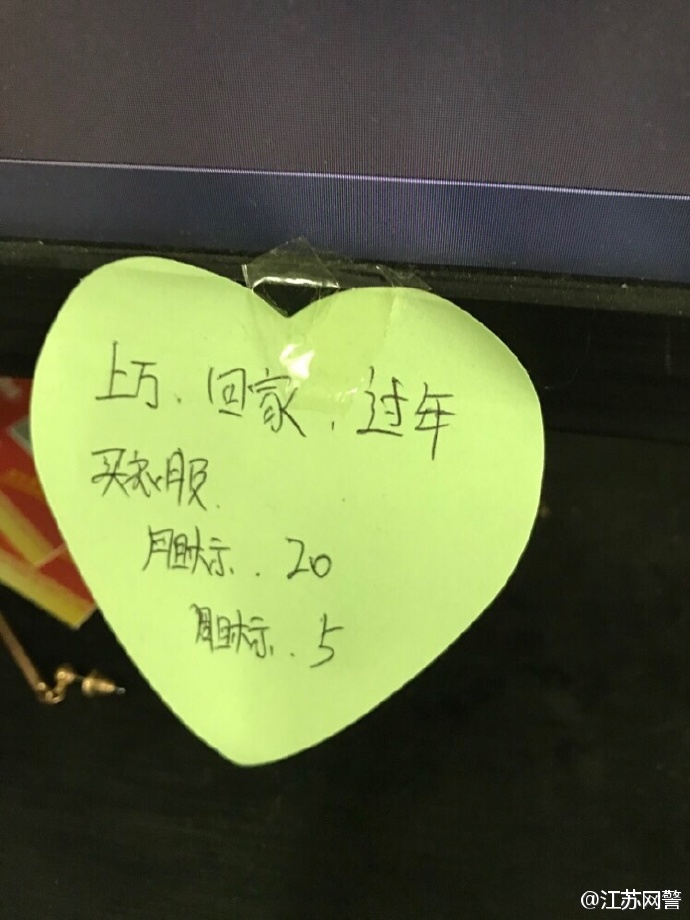 16日,江苏网警官博发布消息称:苏州木渎派出所在@阿里神盾局 的配合下,抓获一个以“代开、代运营淘宝店铺”实施诈骗的团伙。只见现场一台电脑的显示器上,贴着不法分子为自己设置的小目标:一周骗到5人,一个月骗到20人,然后月薪上万,买衣服回家过年。