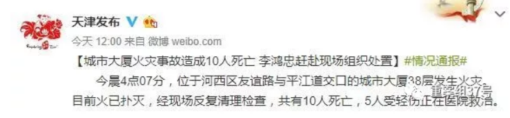 ▲天津市人民政府新闻办公室官方微博发布火灾情况。微博截图