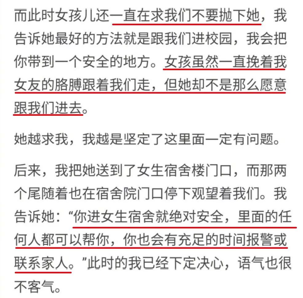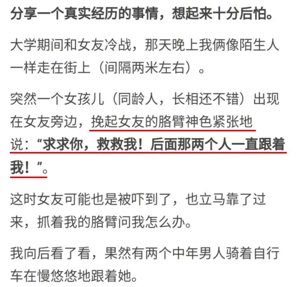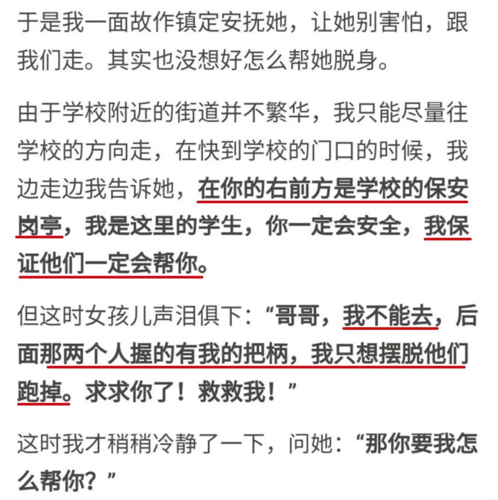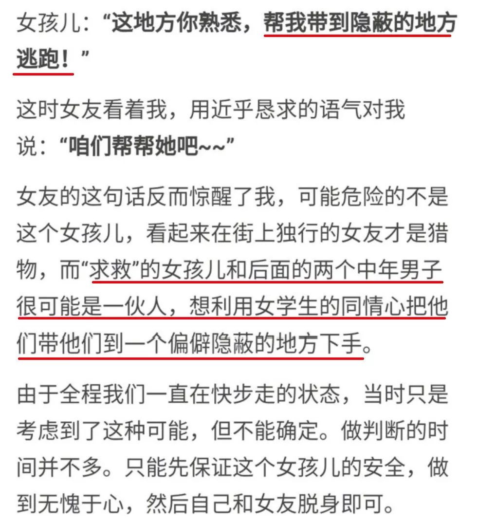 女孩却请求将她带到隐蔽的地方逃跑。这一反常举动,让答主幡然醒悟:“求救”的女孩跟后面的两个中年男子可能是一伙人!!!
