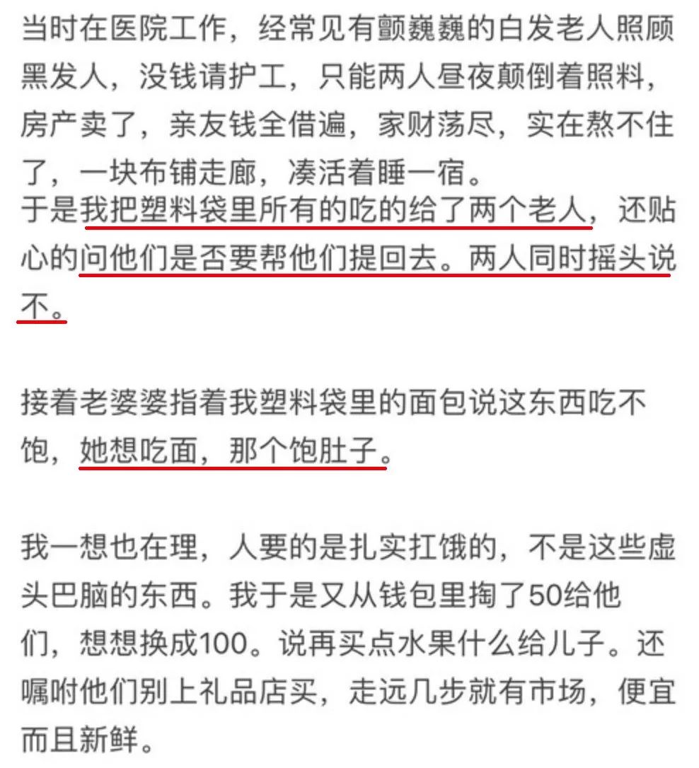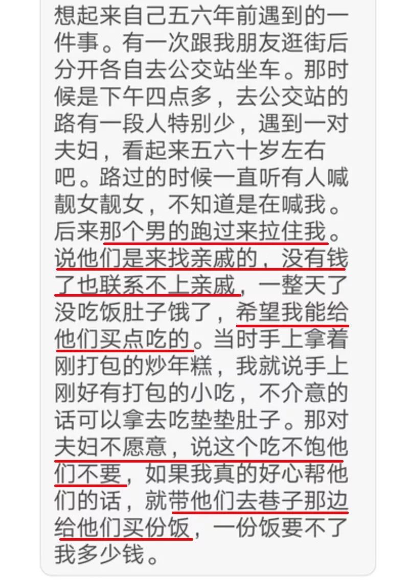 答主 @江五喵 回校途中,遇到一对穿着破烂的老夫妇,说自己饿了好几天没吃饭。答主将塑料袋里的面包递给老人,他们却执意要去吃面。