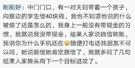 网友小 E 遇到一对夫妇,向路人借钱,还说没有现金的话,可以微信转账。那么问题来了:手机还在,就不能打电话找朋友借吗?