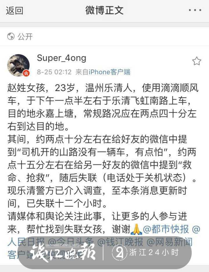 继郑州空姐遇害案后,又一名乐清年轻女孩因为滴滴顺风车遇害。一时间滴滴顺风车成为众矢之的,滴滴随后也宣布全国性关闭滴滴顺风车。滴滴遇害女孩的微博也被网友找到,从微博内容可以看出,女孩是一个漂亮可爱,且积极向上的人。网友6问滴滴为何连出命案?