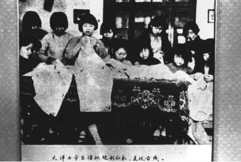 1932年,天津爱国女学生踊跃缝制军衣,支援抗战前线。