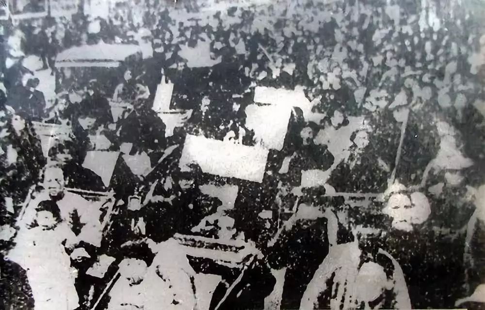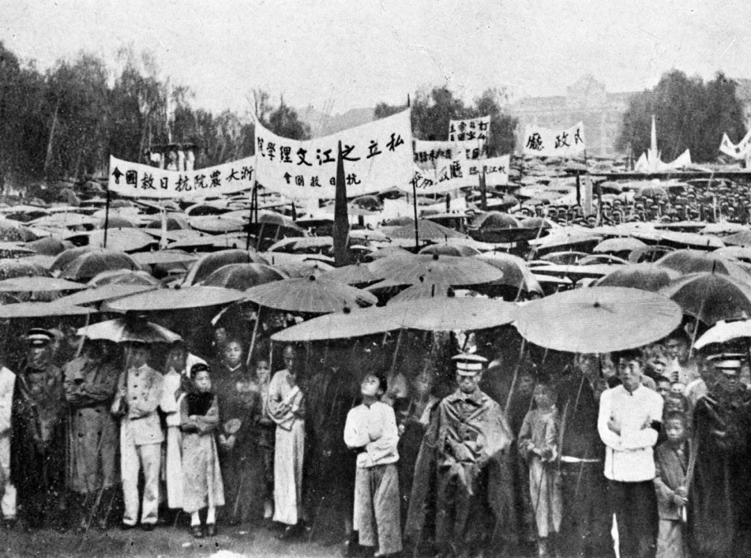 “九・一八”事变后,杭州市举行抗日救国大会。当天大雨,参加大会的十万人在雨中鹄立数小时,悲壮激昂,精神抖擞。