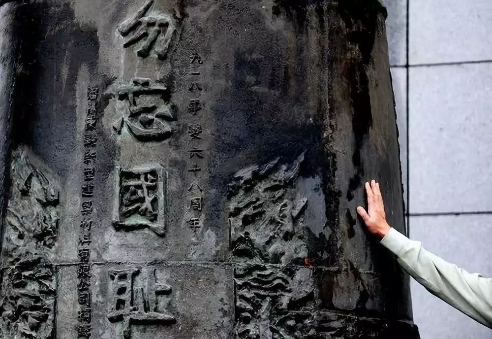 参观者在沈阳的“九・一八”历史博物馆内抚摸“勿忘国耻”警世钟。