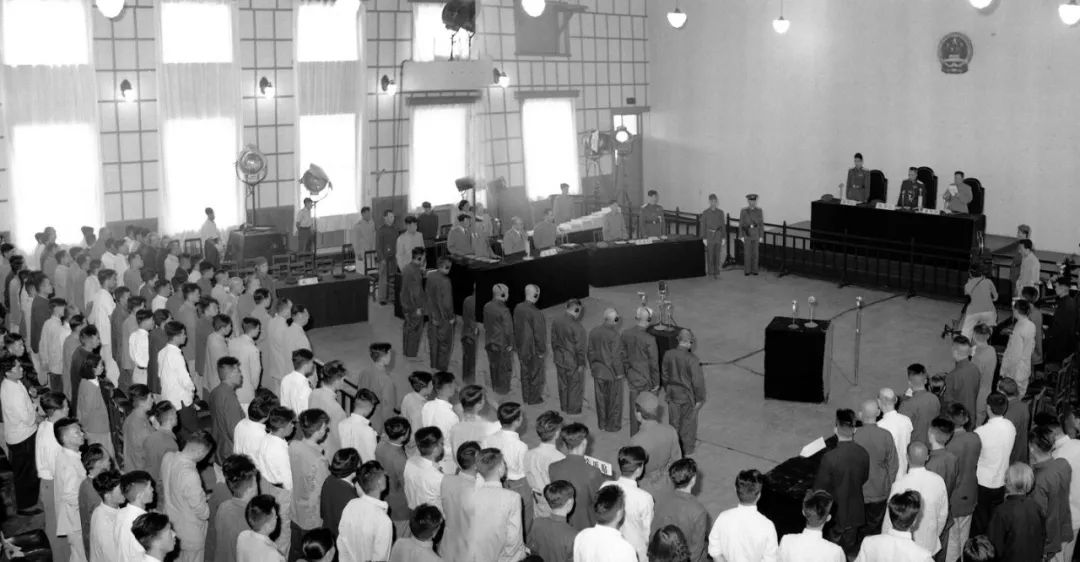 中华人民共和国最高人民法院特别军事法庭于1956年6月9日至19日在沈阳对日本战犯铃木启久等8人进行了审判。图为审判时的情形。