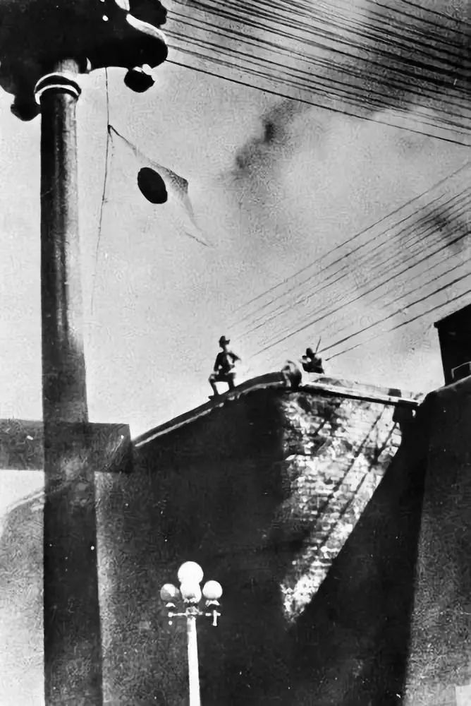 图为日军侵占沈阳城后,耀武扬威地站在城头,悬挂起日本国旗。