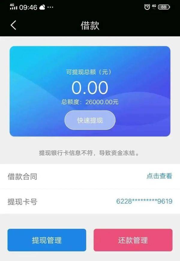 然而过去了好久看到借款的页面还是提示银行卡信息不符,导致资金冻结。