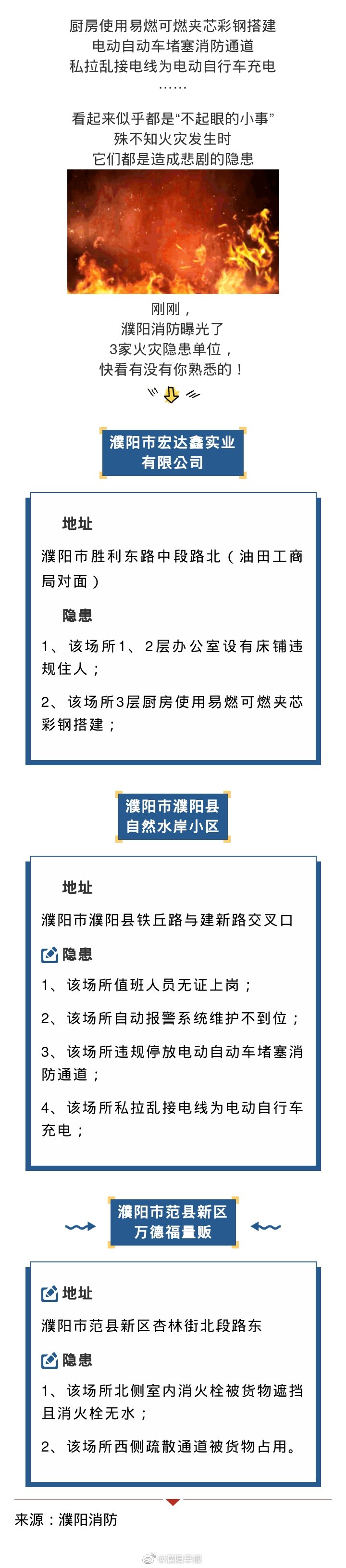 厨房使用易燃可燃夹芯彩钢搭建、电动自动车堵塞消防通道、私拉乱接电线为电动自行车充电……看起来似乎都是“不起眼的小事”,殊不知火灾发生时它们都是造成悲剧的隐患刚刚,濮阳消防曝光了3家火灾隐患单位,快看有没有你熟悉的!